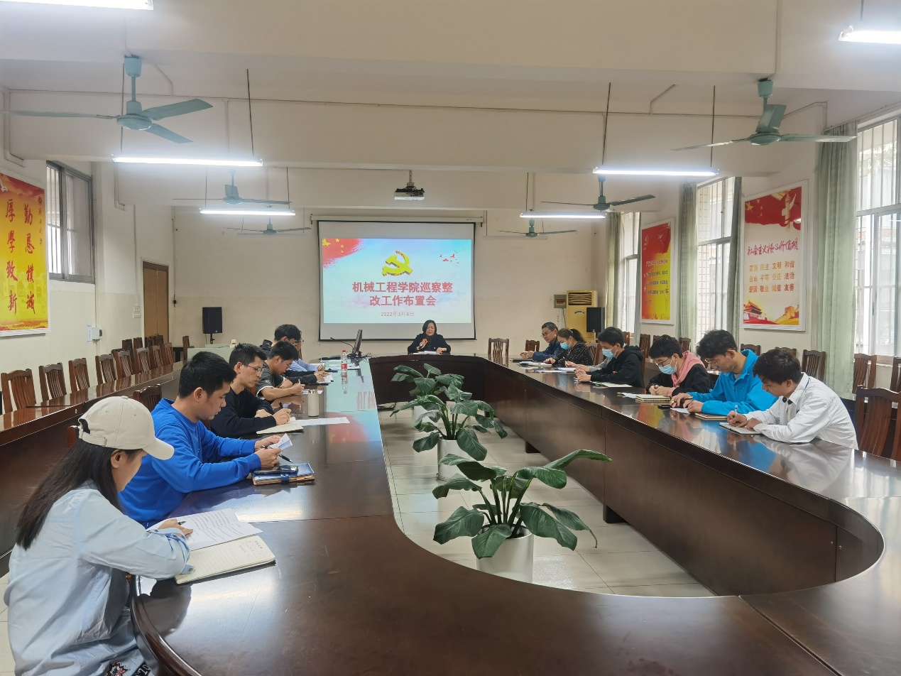 为切实做好校党委对机械工程学院党委巡察反馈问题的整改工作,确保整改及时到位和扎实推进,3月4日下午,院党委召开巡察整改工作布置会。院党委全体委员、全院各党支部的支部书记参加会议。