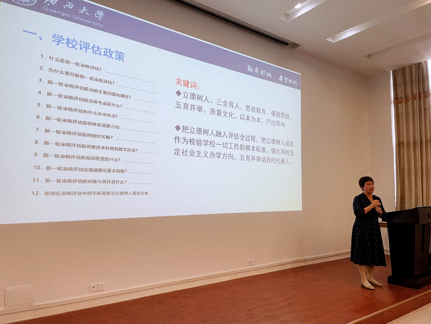院长尤晖要求所有师生员工以积极的心态来迎接审核评估,把此次指导性预评估当作正式评估来认真对待,争取通过指导性评估检视问题,以评促改、以评促建。