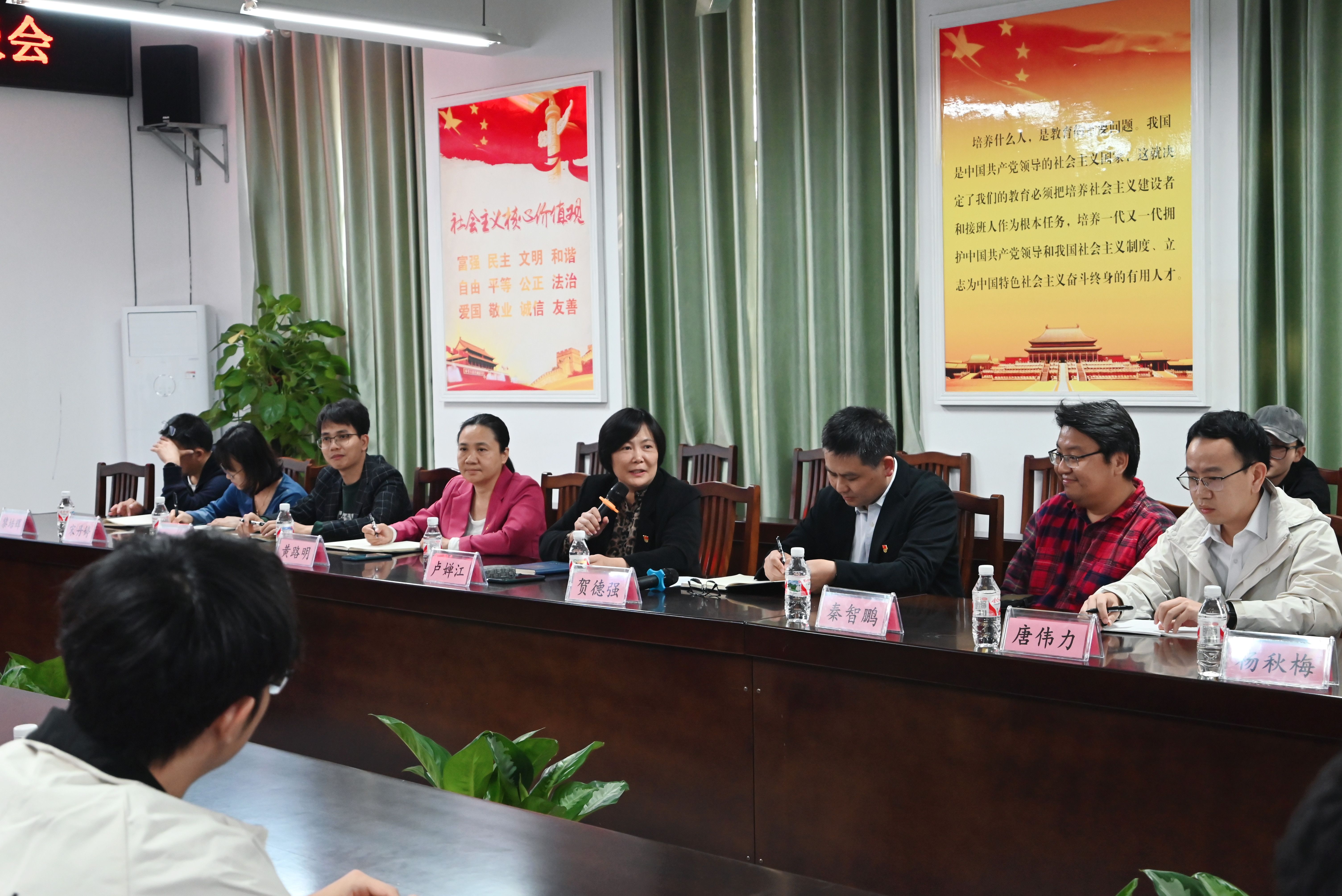 贺德强向与会师生总结介绍了当前我院研究生教育现状,鼓励老师和学生们畅所欲言,互相交流,通过交流的方式找出存在的问题,提出合理的建议,进而获得更好的教学效果和培养质量。