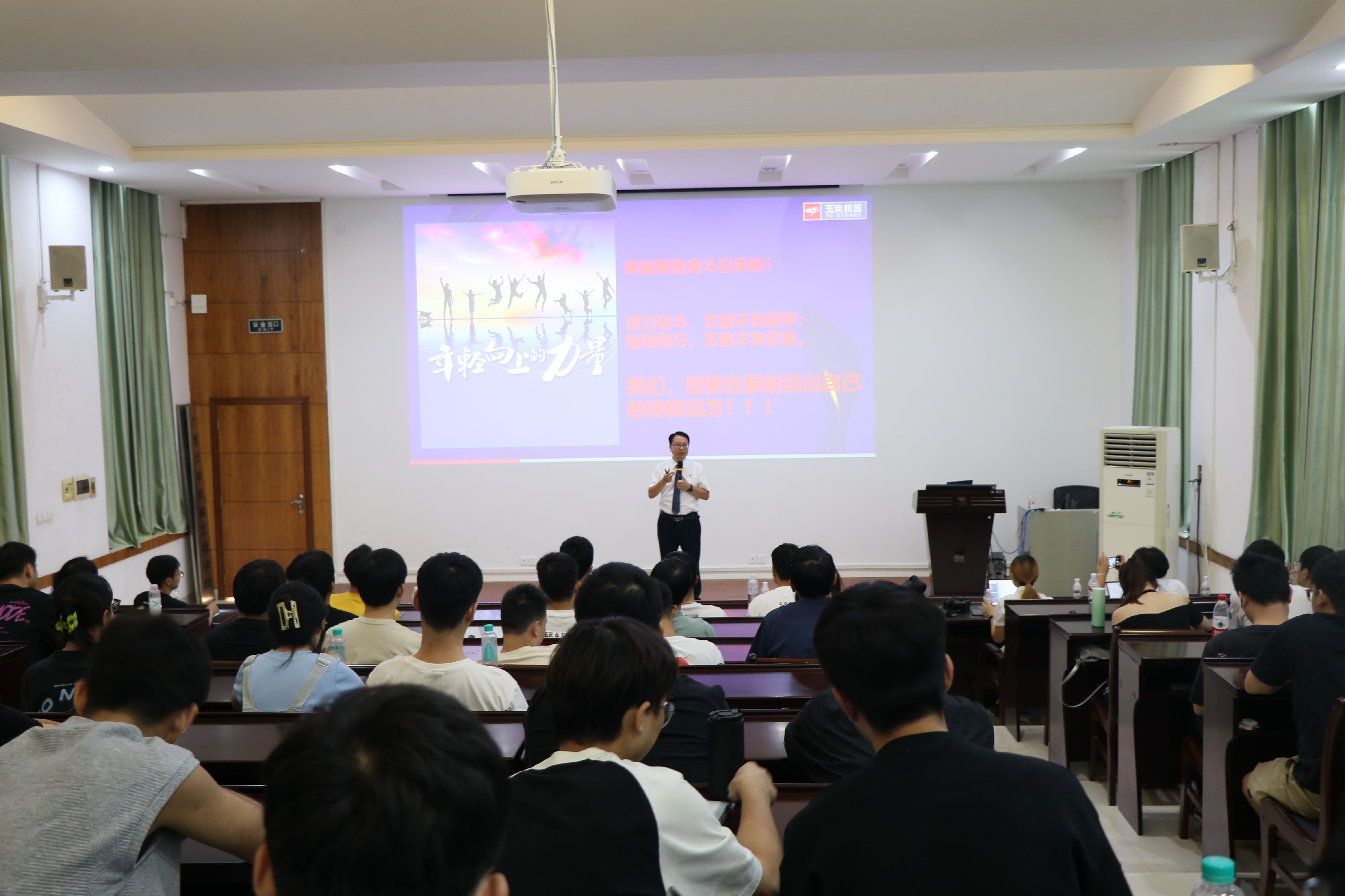 寇传富从科技创新方面分享了个人的工作经验和职业生涯,激励同学们积极培养创新的思维和做好自己的职业生涯规划。他以丰富的专业知识和实践经验,深入浅出地讲解了“新质生产力”和科技创新在国家发展中的重要地位和作用,并通过一系列生动的案例和数据,向大家详细介绍了玉柴的创新发展历程,强调了青年人才在科技创新中的关键作用。最后,他对青年学子提出了几点建议,希望大家志存高远,脚踏实地,明确目标,攻坚克难。寇书记的讲解既站位高远又紧密联系实际,赢得了在场师生的阵阵掌声。