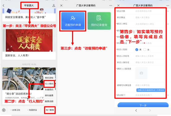 亲爱的校友,为方便大家11月18日返校参加学院建院90周年庆典,请阅读以下须知,按照提示进行入校预约。预约入校通过“平安西大”微信公众号申请,机械工程学院行政办公室审批后入校;预约进校请提前2至3天提交申请。各位校友可根据通行方式分别选择“车辆预约”或“行人预约”(含电动自行车);驾驶电动自行车入校的,须填写电动自行车车牌信息。