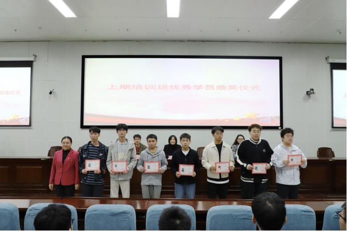 开班仪式的第一项议程是对上期分党校优秀学员进行表彰。院党委副书记黄路明代表学院党委为上一期的优秀学员代表颁发证书并合影留念。