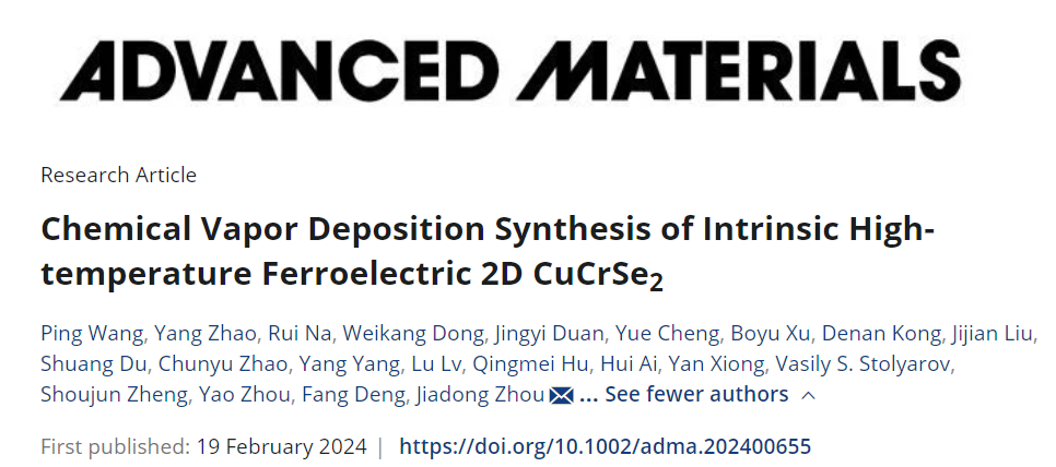 Chemical Vapor Deposition Synthesis of Intrinsic High-temperature Ferroelectric 2D CuCrSe2. (Adv. Mater., 2024, DOI: 10.1002/adma.202400655)