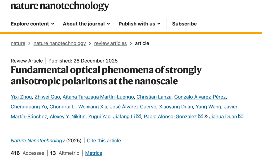 近日,北京理工大学物理学院姚裕贵教授、李家方教授、段嘉华教授与西班牙奥维耶多大学Pablo Alonso Gonzalez教授团队合作,受主编Alberto Moscatelli博士邀请,在《自然》子刊Nature Nanotechnology上发表综述论文,预言了各向异性材料中可能存在的新奇光学现象,总结了纳米尺度上光场能量传播调控策略及其在纳米光子学器件中的应用前景,展望了强各向异性材料走向实际器件应用所面临的关键问题。