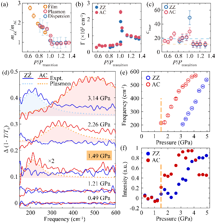 与此同时,在结构相变临界区域,有效质量比、等离激元线宽以及介电常数均出现同步异常,表明相变点附近存在相共存现象与微观无序增强(图3)。远红外测量结果进一步显示,在约1.49 GPa处低频等离激元共振峰突然出现,且随着压力升高持续蓝移并增强,其共振频率与积分强度在该压力以上同步上升,与Lifshitz转变所对应的电子结构重构行为一致(图3)。