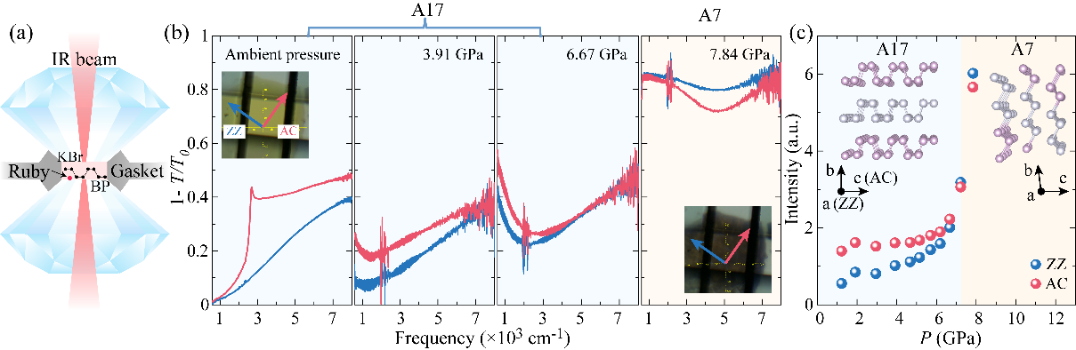 在实验中,研究团队将机械剥离获得的BP薄膜装载至DAC中,通过红宝石荧光峰位移标定压力,并选用KBr或硅油作为传压介质(图1)。偏振分辨显微红外消光光谱结果显示,随着压力升高,样品的红外吸收边逐渐消失,低频自由载流子Drude响应随之显现,表明体系发生由半导体向半金属的电子结构重构;在结构相变临界区域,整体消光强度出现明显增强,并伴随样品透射光学显微图像的显著变化。