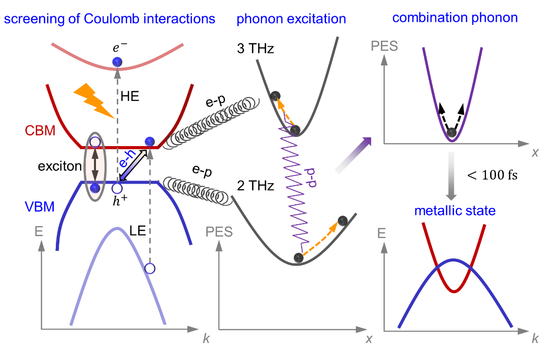 通过研究不同准粒子(电子、声子、激子等)在光场作用下的响应时间以及它们对能隙的影响,基于超快泵浦探测技术的实验手段有望解决这一问题。由于载流子的特征响应时间通常在百飞秒以内,因此被广泛用作电子子系统(e-h)驱动激子绝缘态形成的主要判据。然而,已有的超快实验却存在互相矛盾的结论。例如,采用时间分辨的角分辨光电子能谱(tr-ARPES)进行研究时,在强光场下,能隙的关闭时间小于100 fs,被认为是等离子体诱导下激子关联性减弱的结果,即是一个纯粹的电子过程[Nat. Commun. 9, 4322 (2018)]。然而,也有实验表明,在较弱光场条件下,最大的能隙响应发生在声子响应时间内(约300 fs),表明结构畸变是主导的机制[PNAS 120, e2221688120 (2023)]。这些相互矛盾的实验结果暗示着可能存在多种机制共同作用,导致激子绝缘体形成的复杂过程。