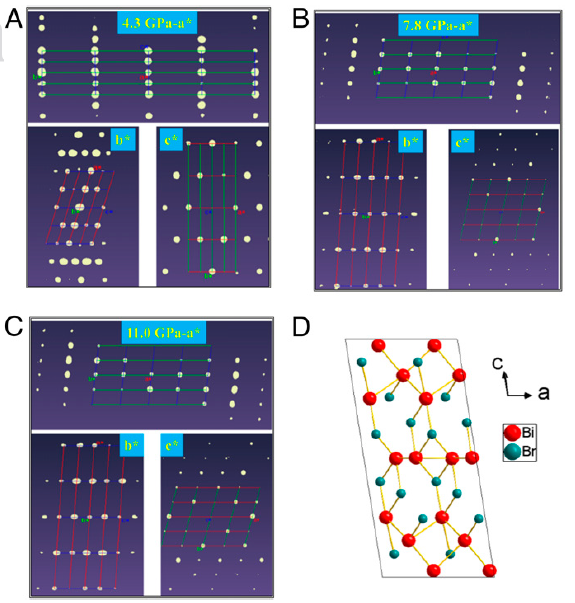 图4. 不同压力下 Bi4Br4单晶的结构。