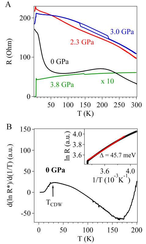 图2. (A)α-Bi4Br4单晶在不同压力下的电阻-温度依赖关系;(B)常压下α-Bi4Br4单晶的对数电阻随温度倒数的变化关系。