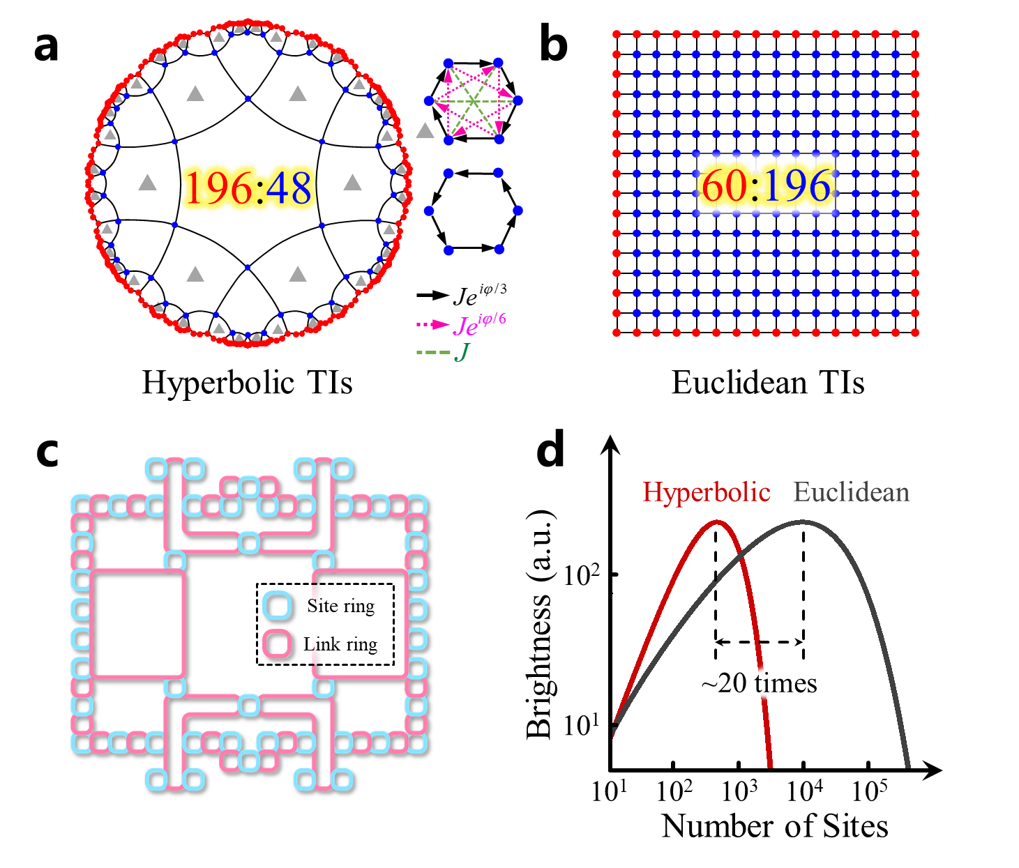 双曲空间是具有常数负曲率的非欧几里得空间,在自然界和人工系统中广泛存在,并在不同领域发挥着重要作用。最近,有报道[Nat. Commun. 15, 1647 (2024)]指出基于耦合波导谐振腔成功实现了人工双曲晶格模型。区别于传统拓扑边界态,由实空间陈数保护的双曲拓扑态具有显著增强的边界响应。因此,双曲光拓扑态有望提升拓扑光子器件的结构和材料利用率,在高密度拓扑光子集成领域具有潜在的应用。