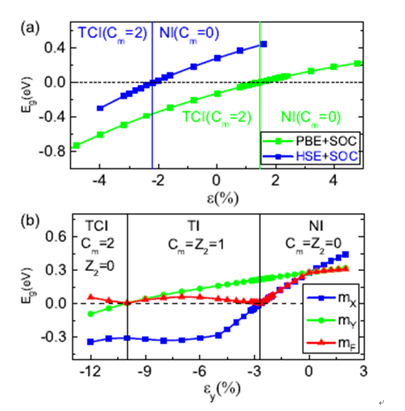 图2.单层硫化铅的带隙以及能带拓扑性质在 (a) 双轴应变和(b)单轴应变下的演变。